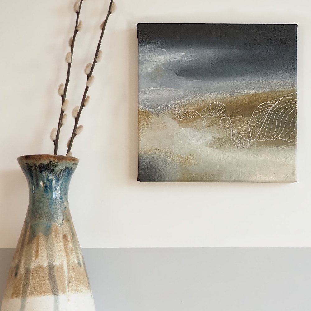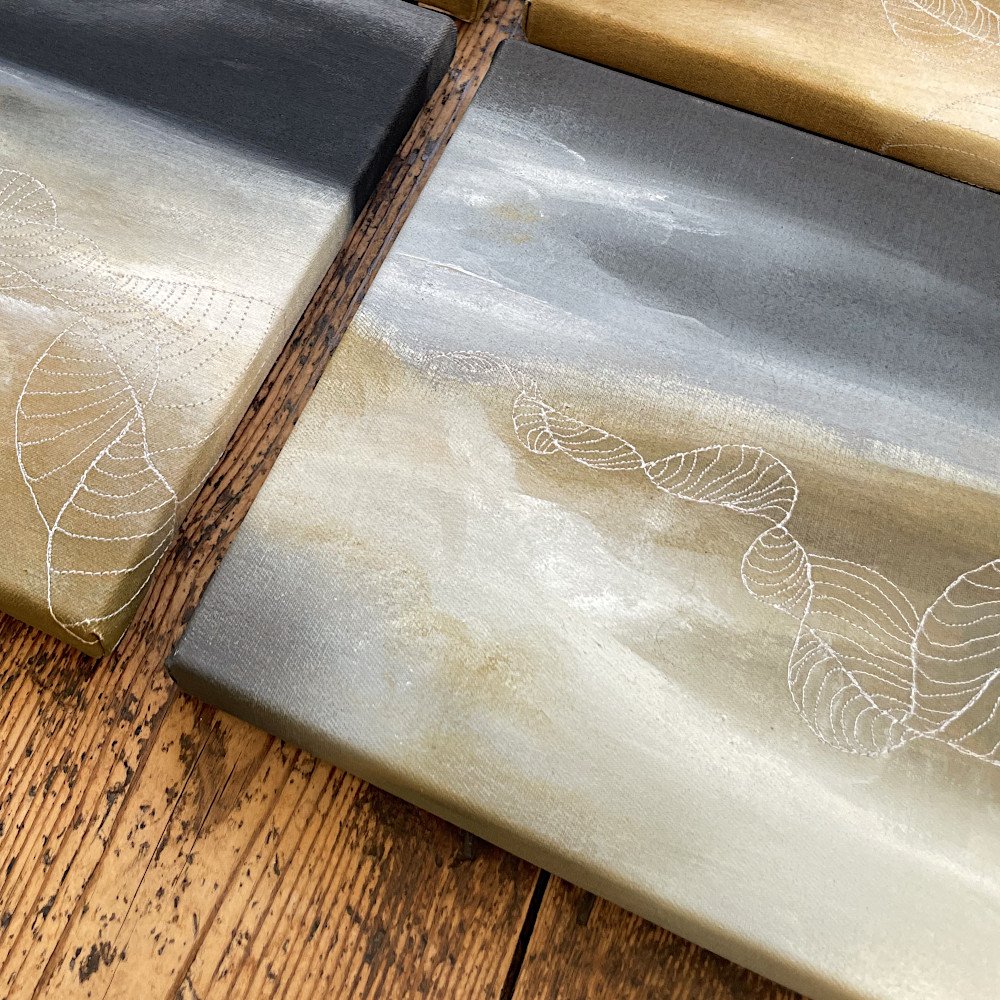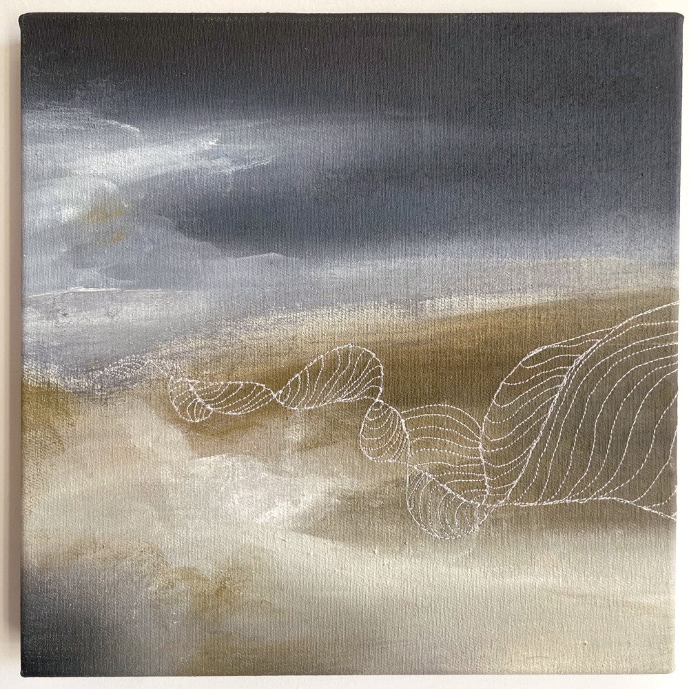 This is an acrylic and thread painting on a 3/4″ (2cm) gallery wrapped canvas. The edges are painted and stitched so you can hang it unframed. Treated with a matt UV protectant varnish.