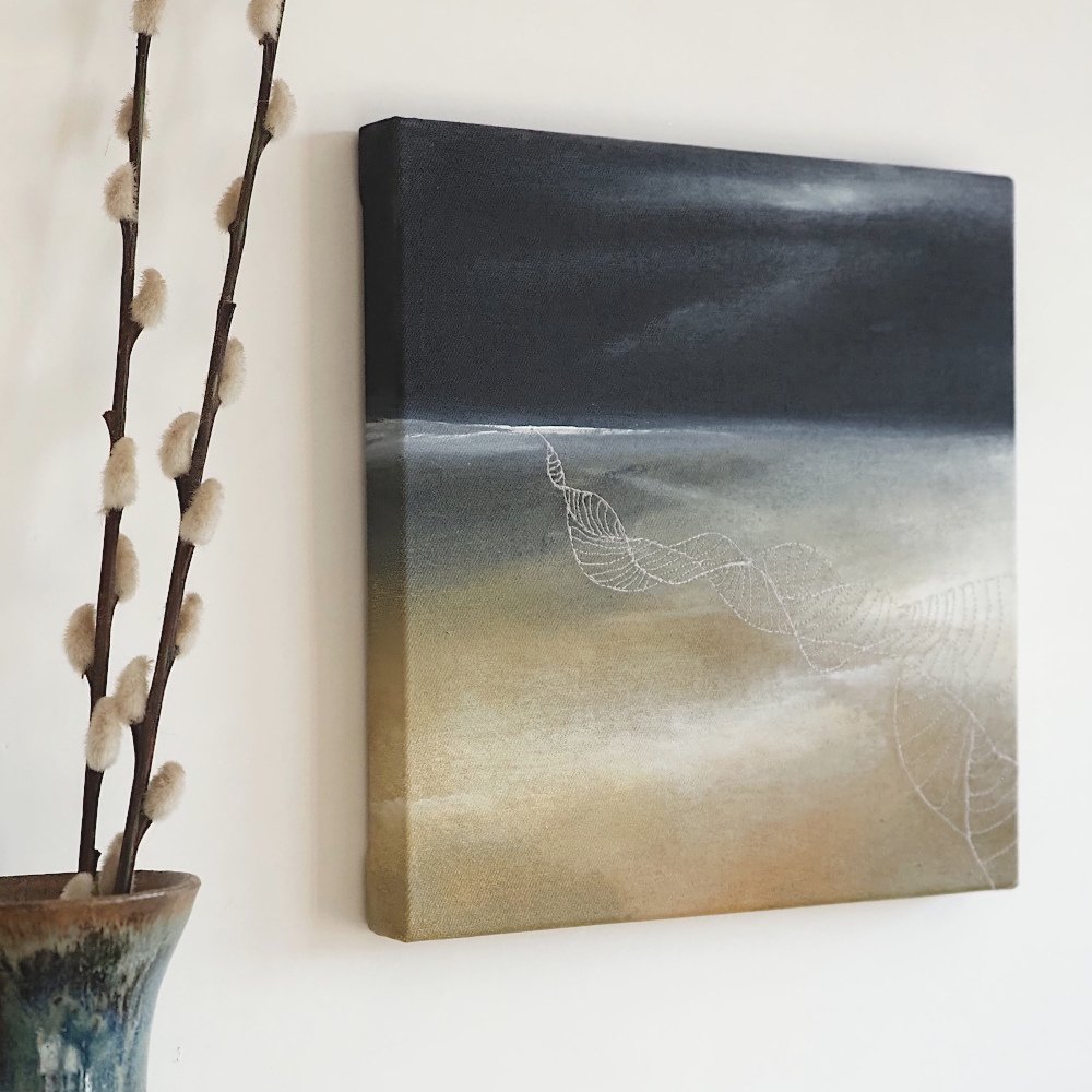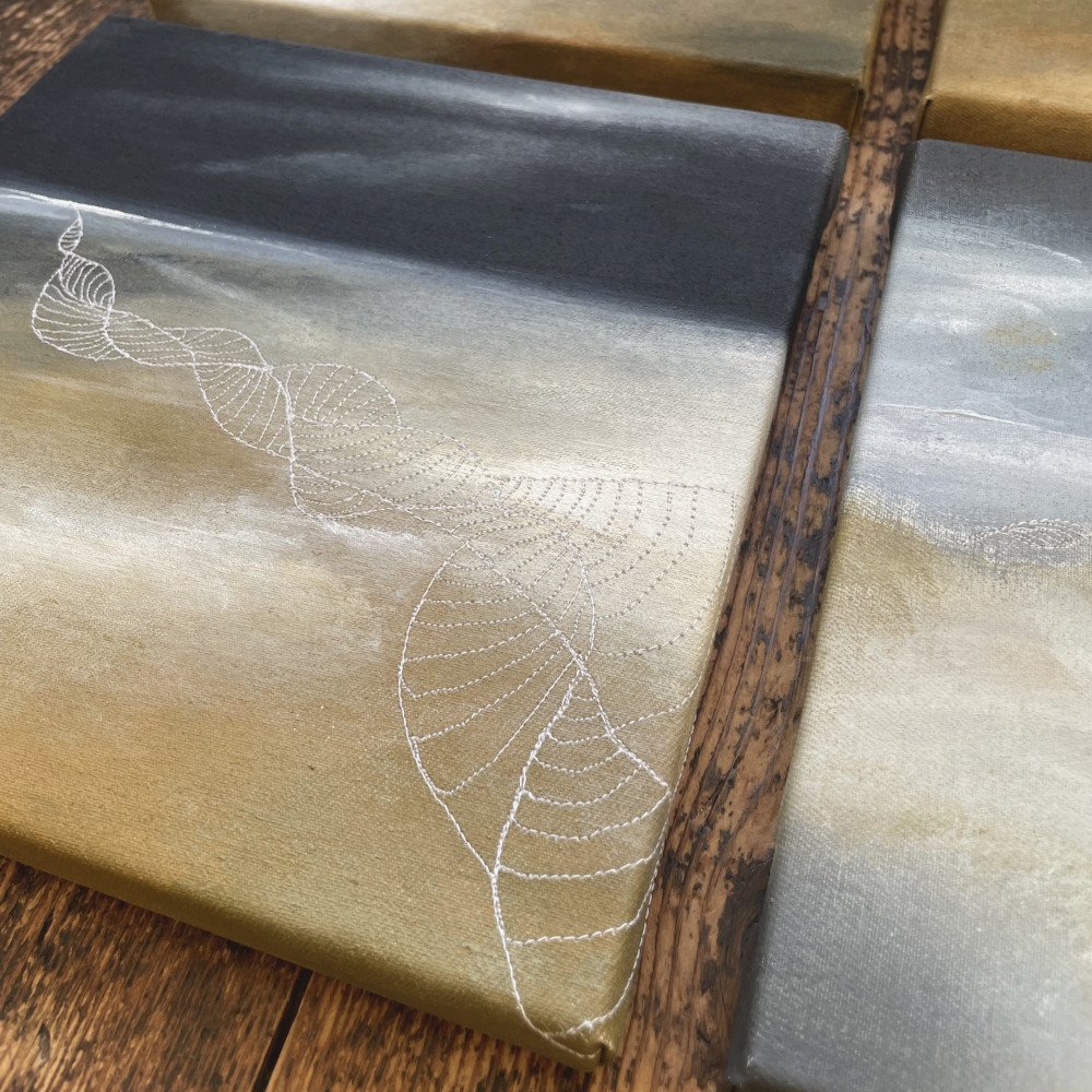 This is an acrylic and thread painting on a 3/4″ (2cm) gallery wrapped canvas. The edges are painted and stitched so you can hang it unframed. Treated with a matt UV protectant varnish.